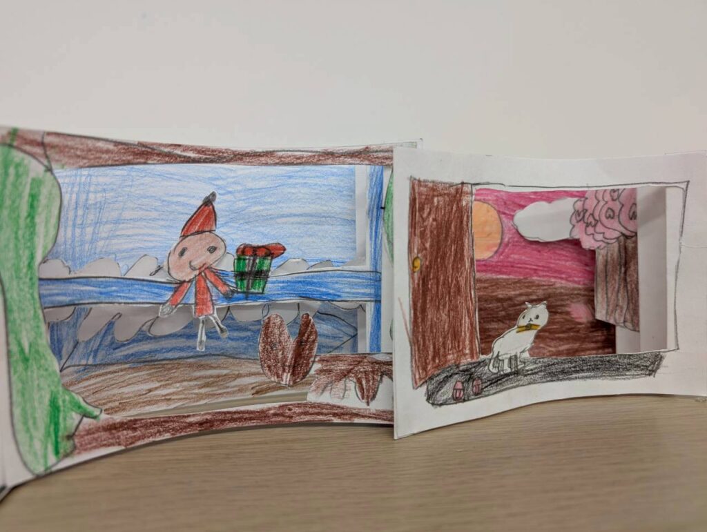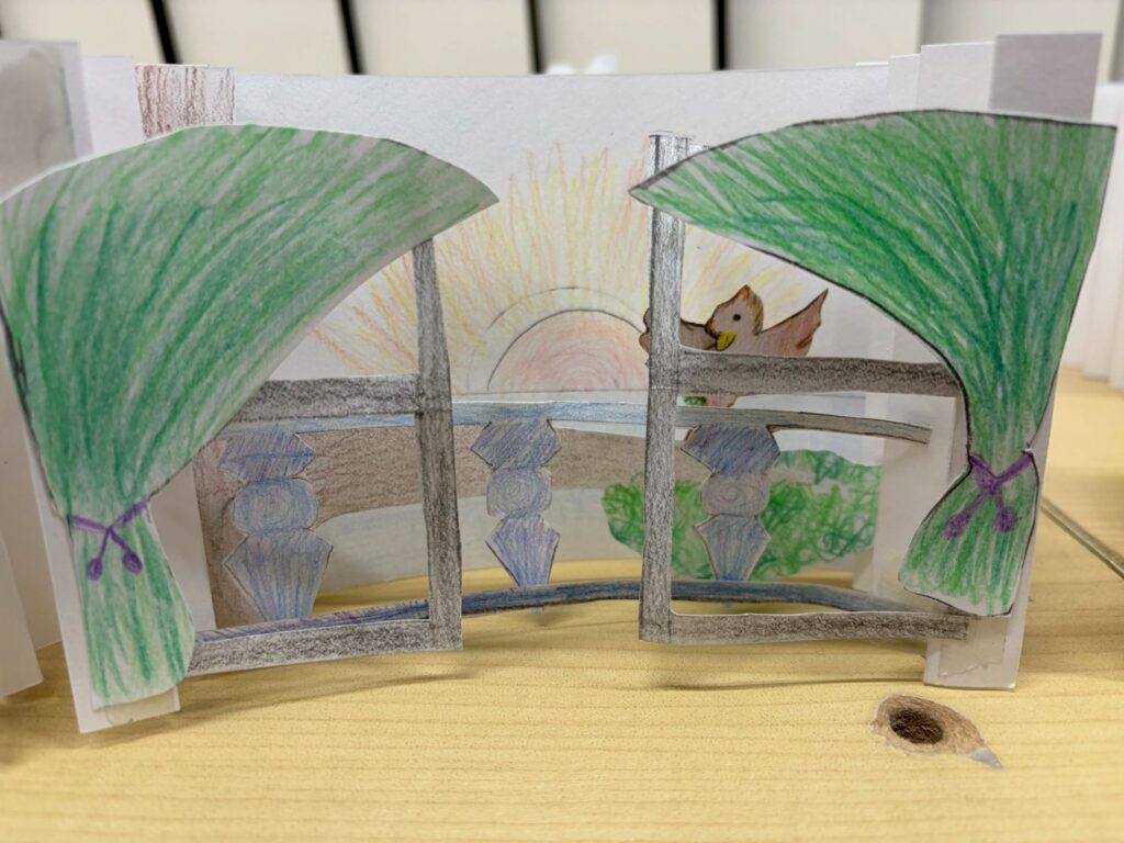 完成した作品は、まるで小さな舞台の幕が上がる瞬間のような、奥行きとドラマに満ちた一枚。子どもたちの表情には達成感と自信が溢れていました。