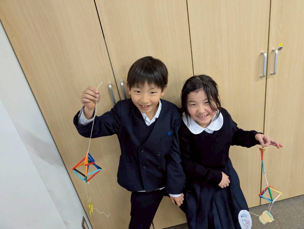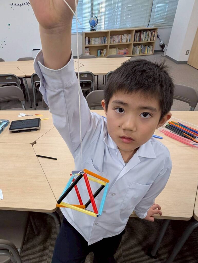 ストローで立体的な多面体を組み上げる工程は、空間認識力と根気が必要。最初は戸惑いながらも手順を覚えると、より複雑な形へと自ら挑戦していく子どもたちの姿が見られました。