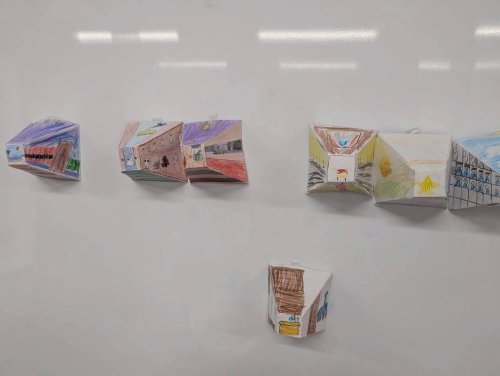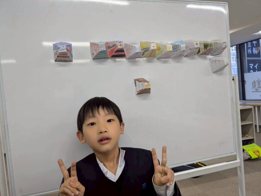 美術の技法「一点透視図法」を実際に使いながら制作するこの課題は、算数・図形の概念とも深くつながっています。「見る人をだませるかな?」という問いかけが、子どもたちの集中力を引き出しました。